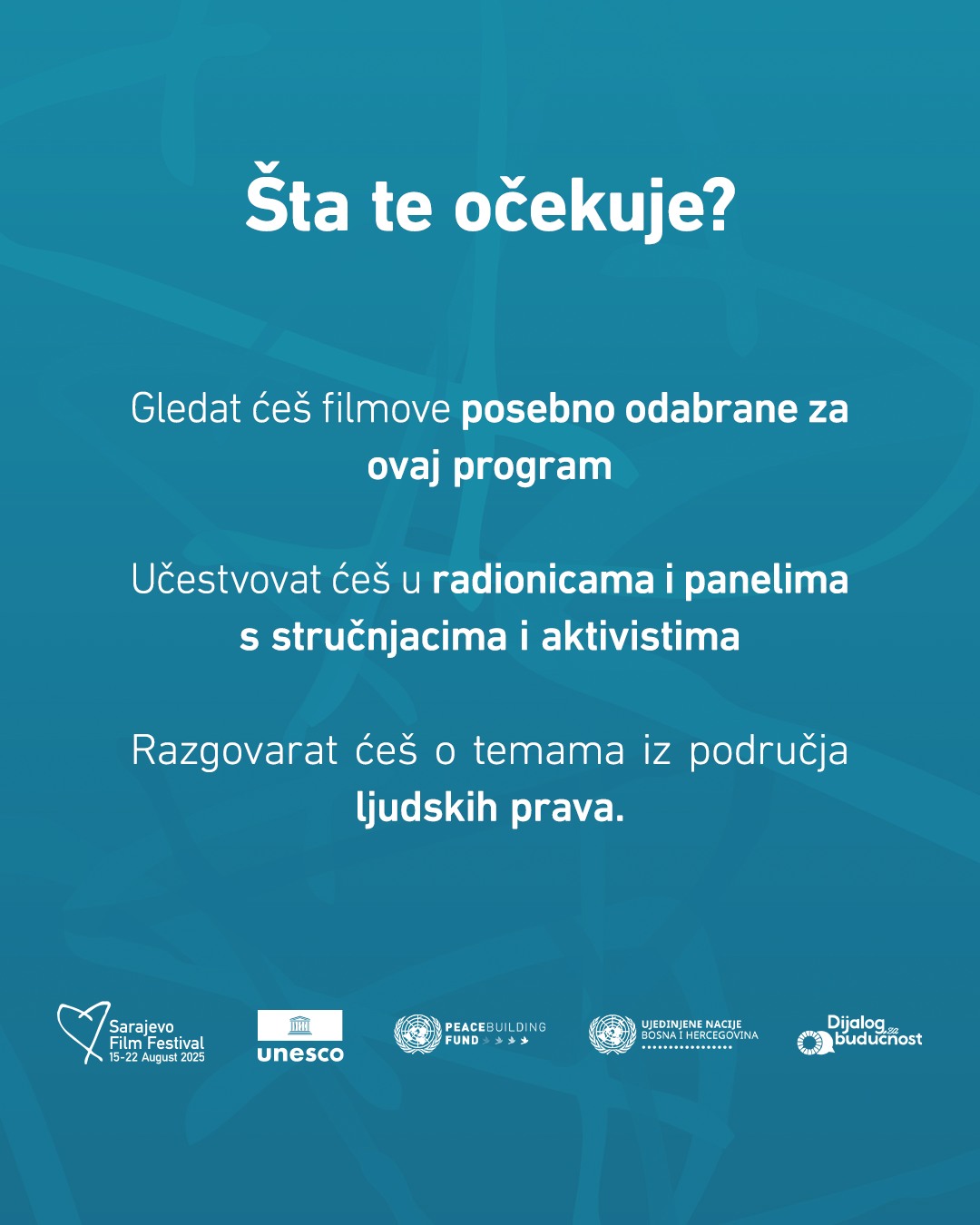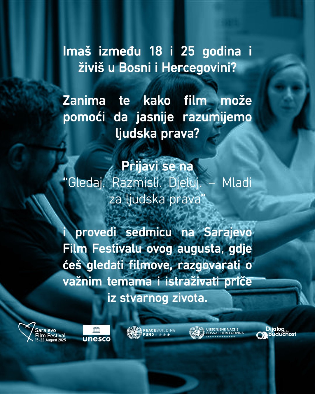 Prijavi se na “Gledaj. Razmisli. Djeluj. – Mladi za ljudska prava” i provedi sedmicu na Sarajevo Film Festivalu ovog augusta, gdje ćeš gledati i razgovarati o filmovima koji se bave ovom temom.