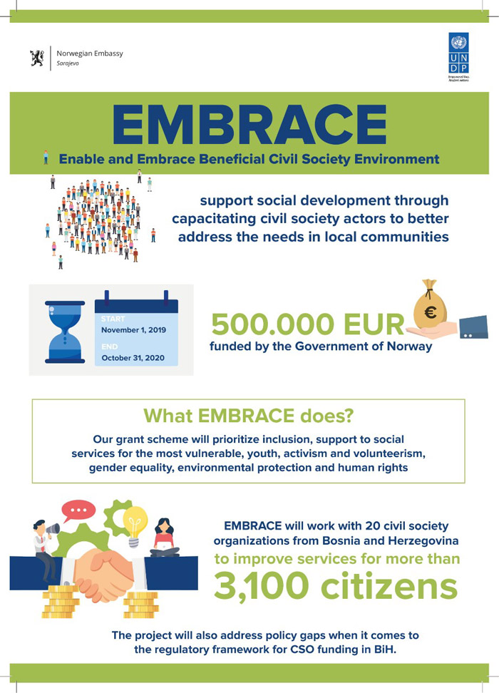 Ovaj projekat podržan je ktorz projekat Stvaranje povoljnijeg okruženja za civilno društvo – EMBRACE, finansira Vlada Kraljevine Norveške, a implementira Razvojni program Ujedinjenih nacija (UNDP).