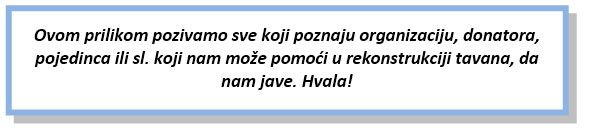 - I, akoBogda početak realizacije rekonstrukcije tavana iznad naših kancelarija, koji smo dobili od grada Tuzla na korištenje, te otvaranje Centra Aktivista Tuzle. Do sada smo uspjeli očistiti i izbaciti smeće koje se decenijama nakupljalo na tavanu (otprilike 4-5 tona papira, drveta, lima, stakla i ostalog smeća), ali i pronaći dosta fotografija Tuzle i aktivnosti sportskih klubova i mladih u periodu 1960 – 1985. Od ovih fotografija planiramo napraviti izložbu u skorije vrijeme. U očekivanju urbanističke saglasnosti i građevinske dozvole, krećemo polako sa namicanjem sredstava